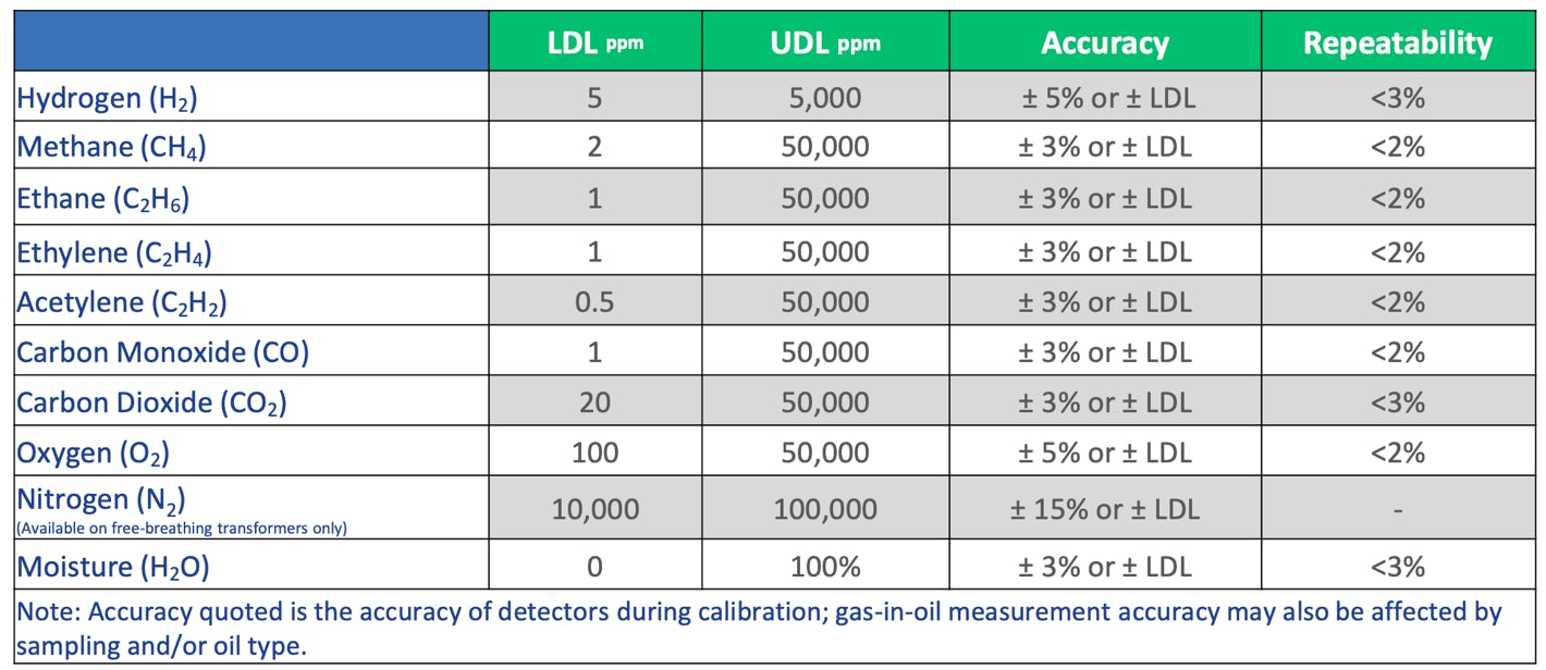 La TECNOLOGÍA PAS tiene la capacidad de medir los gases principales de falla para diagnósticos especializado, como son el CO, CO2, etileno, etano, metano y acetileno. El Hidrógeno y el oxigeno es medido con dos sensores adicionales, el nitrógeno es calculado, se suma a esto la medición de humedad.